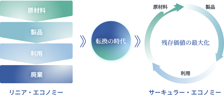 大量生産・大量消費の末に大量の廃棄物を生み出し、資源を浪費し続ける「線形経済(リニア・エコノミー)」から、限りある資源から最大の付加価値創造を目指す「循環経済(サーキュラー・エコノミー)」へ。