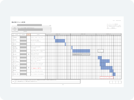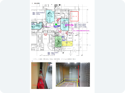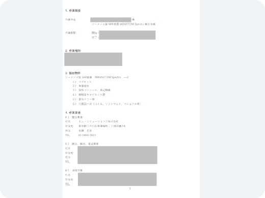 作業日程と工程、使用車両や確認事項等を記載した計画書を作成いたします。ご施設様や新規装置のメーカー様と作業の確認と調整を行います。